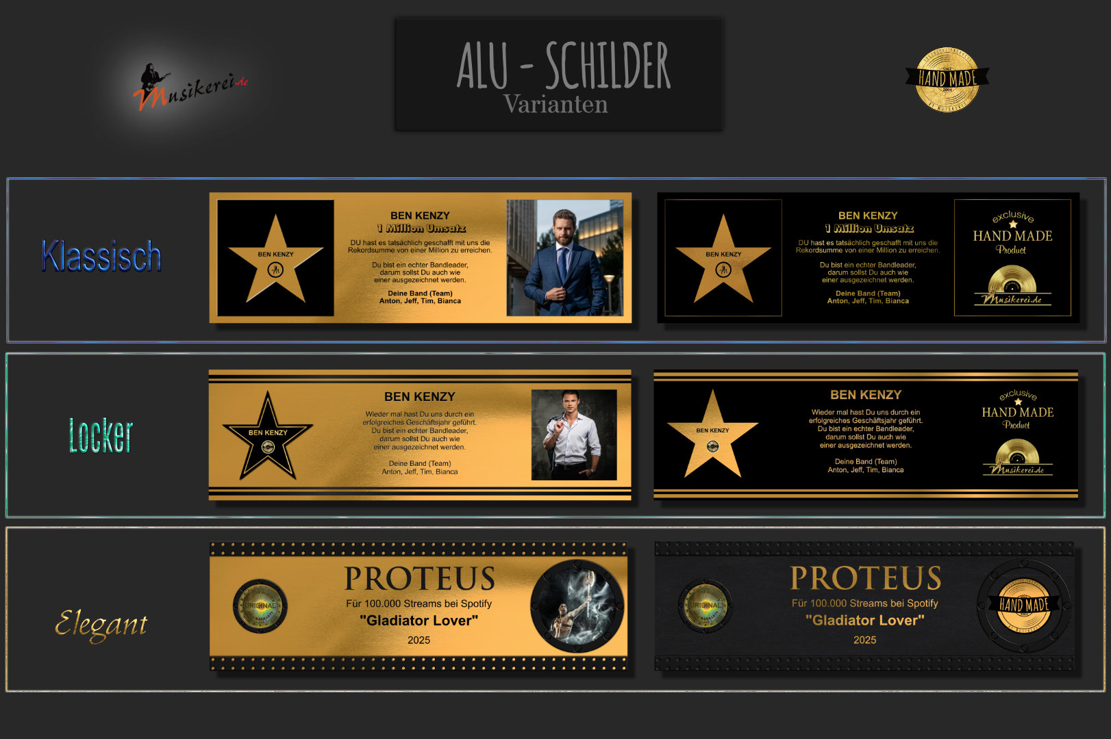 Inkl. Ihr eigener Wunschtext in der Mitte, links der Stern mit Namen oder Vignette, rechts Branding (Handmade),